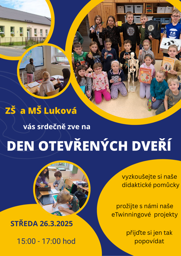 Srdečně zveme sourozence, rodiče, prarodiče a veřejnost do naší mateřské a základní školy. Přijďte se podívat, zahrát si a popovídat si.